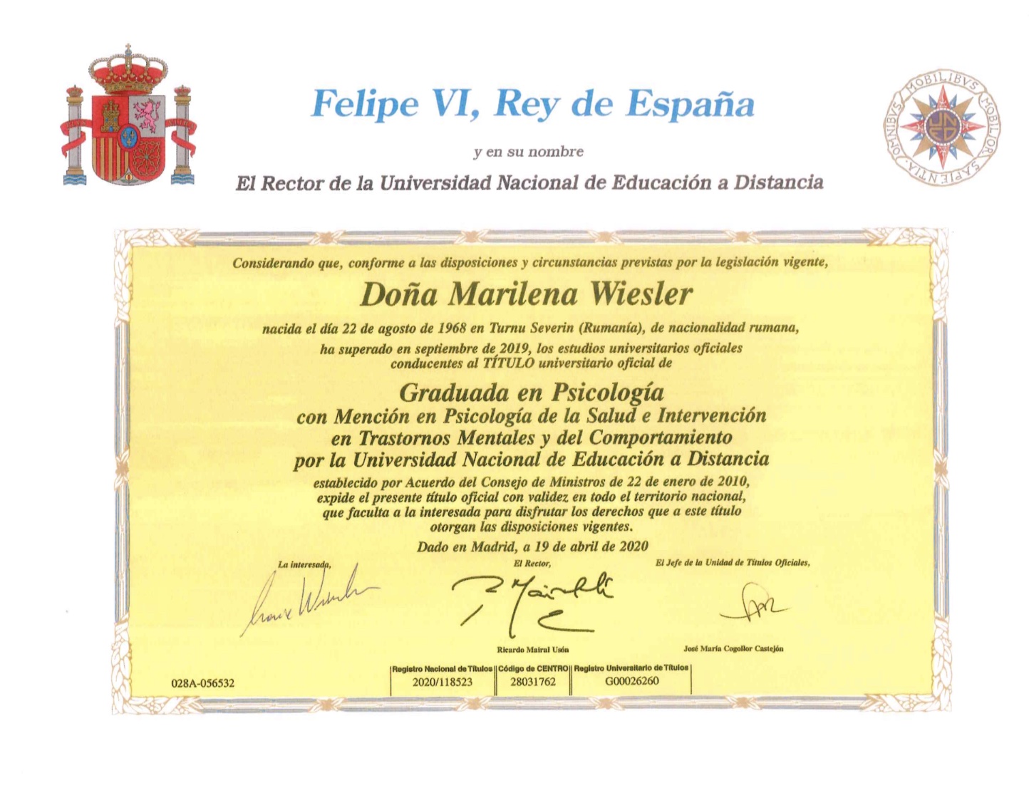 Bachelor’s degree in clinical psychology from UNED and bachelor’s degree in law from the University of Bucharest. Master’s degree in International Relations.